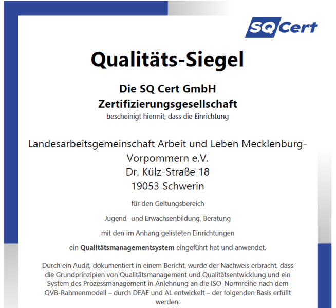 Wir sind wieder für 3 weitere Jahre rezertifiziert nach dem QVB-Rahmenmodell (Qualitätsentwicklung im Verbund von Bildungseinrichtungen) Stufe B. Warum uns das eine eigene Meldung unter “News” wert ist? Weil es für uns mehr ist, als das Erfüllen formaler Anforderungen zur Förderung unserer Einrichtung. Es ist vor allem auch ein Versprechen nach innen wie nach außen. Wir verstehen Qualitätsmanagement als Querschnittsaufgabe und als Orientierungsrahmen in schwierigen Zeiten. Wir halten fest, an welchen gemeinsamen Aufgaben wir arbeiten und uns weiter entwickeln wollen. Wir verstehen uns dabei als lernende Einrichtung, die sich selbst permanent hinterfragt. Wir möchten schnell und bedarfsgerecht darauf reagieren, welche Themen Menschen bewegen und dabei gleichzeitig verbindliche Standards einhalten, die ein sicheres Lernumfeld schaffen, von dem alle profitieren und in dem sich alle wohl fühlen und voneinander lernen können. Auch für unsere eigene Struktur, in Zeiten, in denen es für NGOs wie uns nicht einfach ist, den Kopf über Wasser zu halten, ist eine kontinuierliche Qualitätsentwicklung unerlässlich. Wir wünschen uns sehr, dass Menschen sich bewusst FÜR uns als Arbeitgeber und FÜR unsere Angebote entscheiden. Daher werden wir für euch und uns in den kommenden Monaten auch noch einmal unser Leitbild überarbeiten und es euch an dieser Stelle anschließend zur Verfügung stellen.